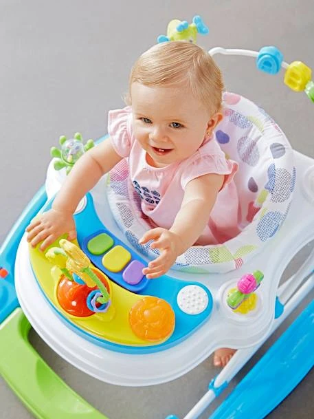 – dès 6 mois, il se fait trotteur avec espaces de jeux ludiques et colorés, tapis repose-pieds et fonction balancelle